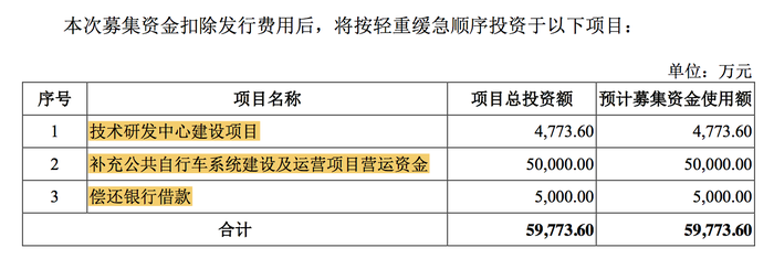 此次永安行IPO计划发行2400万股,股票发行价26.85元,计划募资5.8亿元。其招股书显示,永安行将募资用于技术研发中心建设项目、补充公共自行车系统建设及运营项目营运资金、偿还银行借款。