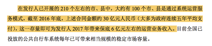永安行招股书显示,仅系统运营服务一项,约100个县市可为永安行在2017年带来保底6亿元的收入,而系统运营服务占永安行整体收入2014-2016年平均约65%的比例。按此比例计算,2017年永安行来自政府对于有桩单车的相关营收在9亿元以上。入驻城市政府对于有桩单车的平均支出,2017年将约为900万元。这些费用将成为政府在支持公共出行的财政支出。