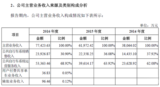 但共享单车业务对永安行来说只是“小打小闹”。招股书中显示,2016年永安行主营业务中,来自于共享单车业务收入只占永安行的0.05%,与政府合作的有桩单车相关业务(公共自行车系统销售收入、公共自行车系统运营服务)的收入所占比例高达99.82%。有桩单车业务也将持续做为永安行的支柱业务持续发展。