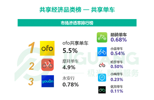 自共享单车崭露头角,摩拜、ofo发展势如燎原,奠定共享单车行业第一梯队的格局。永安行紧随其后,位列共享单车第二梯队“头牌”。据极光大数据在6月对共享单车市场渗透率的排名,永安行以0.78%的市场渗透率仅次于ofo5.5%、摩拜4.9%位居行业第三名。
