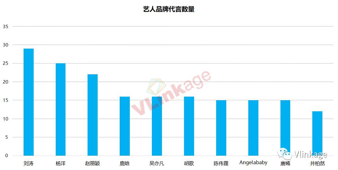 先来看看明星代言品牌的数量,以下为代言商品数量排名前十的艺人: