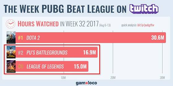 不仅如此,尚不是电竞产品的《绝地求生》显然也已经成为直播领域的宠儿。来自国外数据网站Gameloco的统计数据显示,在上周的直播网站Twitch“游戏观看总时长”中,《绝地求生》以1690万小时,击败了1500万小时的《英雄联盟》,位居第二位,而位居第一位则是刚刚举办完国际邀请赛的《DOTA2》。