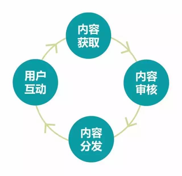 如上图,从一百万年前人类诞生开始,传播就由以上四个环节组成——内容获取(生产)、内容审核、内容分发,以及用户互动。