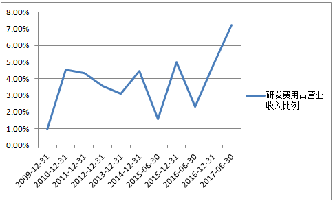 据Wind数据库统计,机器人2009年上市后的研发费用占营业收入的比例,仅有2015年全年以及2017年上半年勉强达到或超过了5%的水平,其余年份均小于5%。上市8年以来累计研发费用仅为5亿元,显然这与拥有悠久历史的机器人“四大巨头”瑞士ABB、日本安川、德国库卡以及日本川崎重工是无法比拟的。