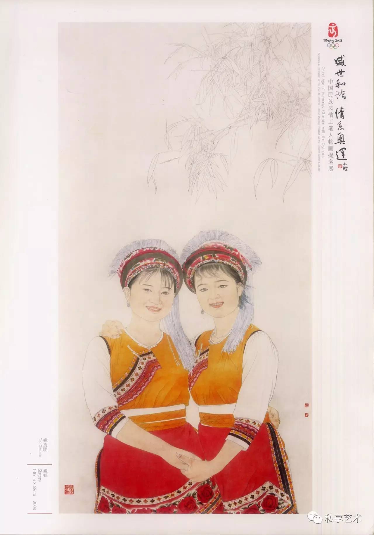 《姐妹》 130×68cm 参加“盛世和谐,情系奥运中国民族风情工笔人物画提名展”