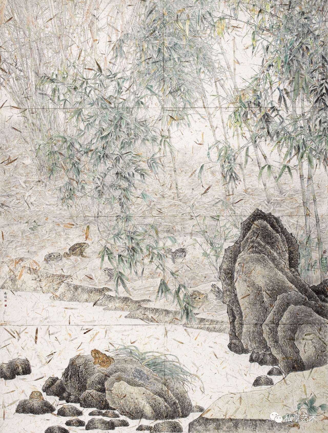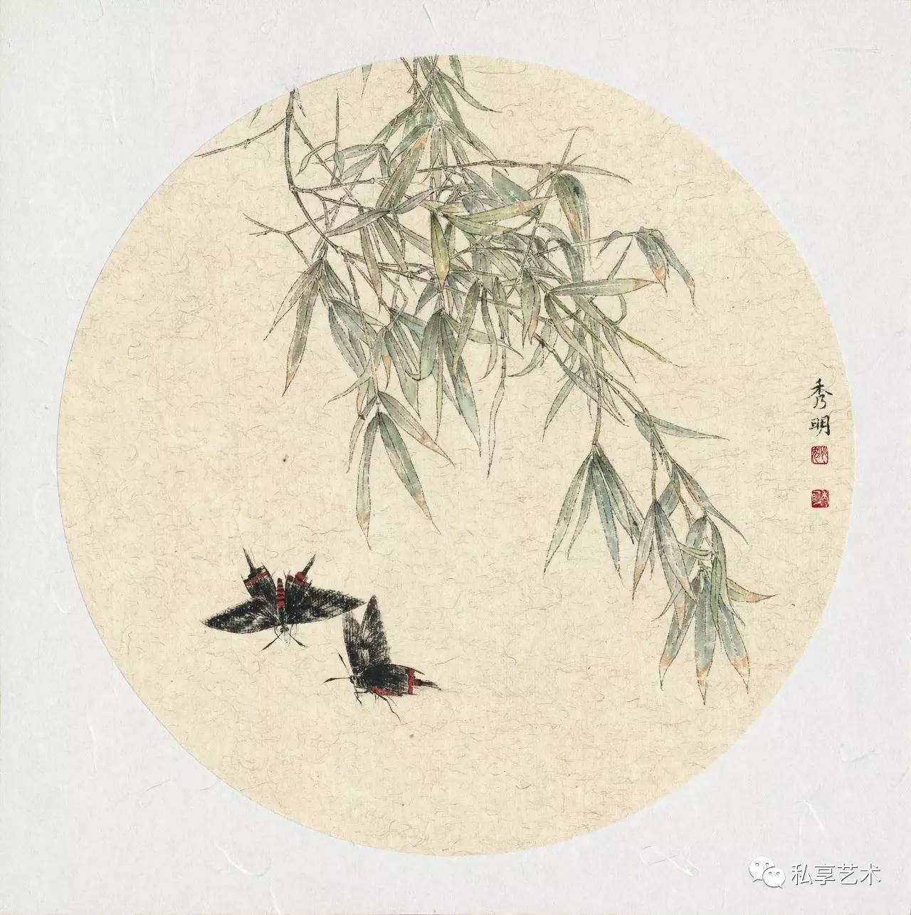 其中的竹子就并不是什么高洁志节的象征,斑鸠也并不意味着什么落寞或孤寂。那竹叶的层叠、掩映,那竹枝的伸展、弯垂,以及那斑鸠或观瞻或理羽的姿态,已天然地构成了一幅美与和谐的图景;竹的叶片映射着露水晶莹,仿佛一股带着微凉的初秋空气,正飘散在枝叶摇曳之间;而斑鸠的羽毛仍是那样翠绿,在这竹叶已经泛黄的季节……这大概就是秀明要在这一作品中所要表现的,同时也是他在自然中所发现的万物生命情态之美。