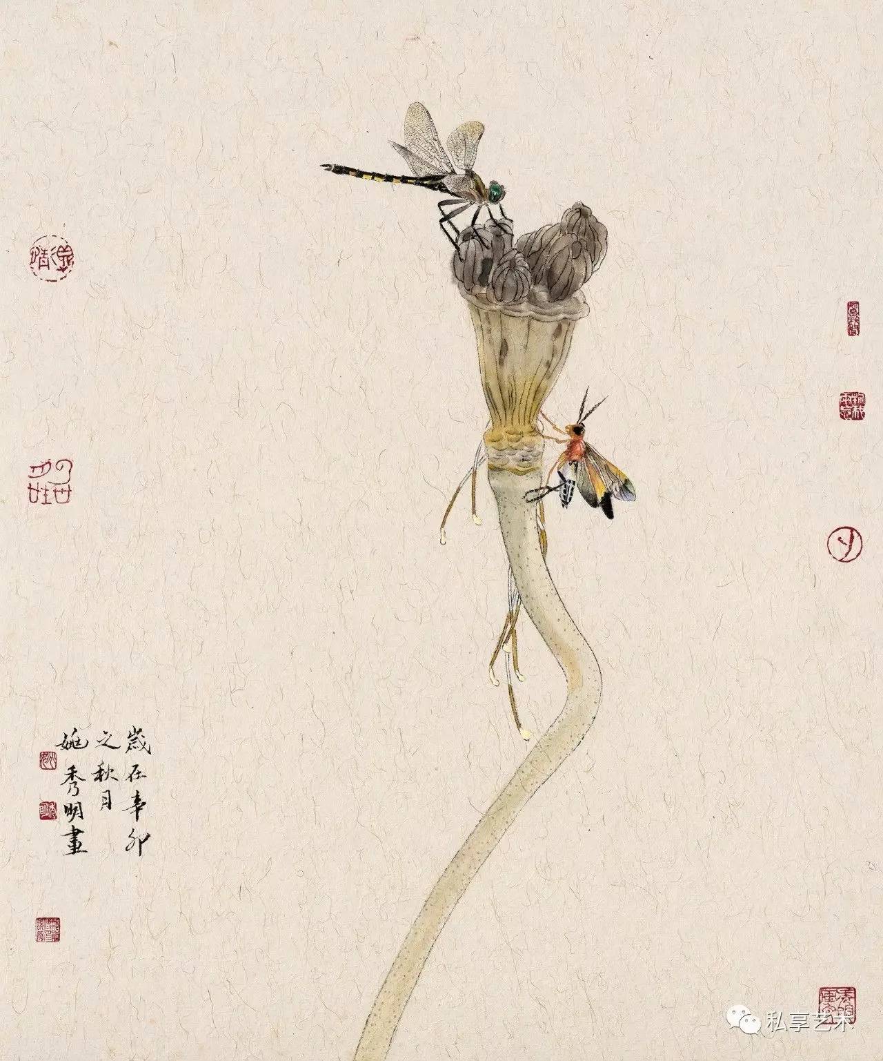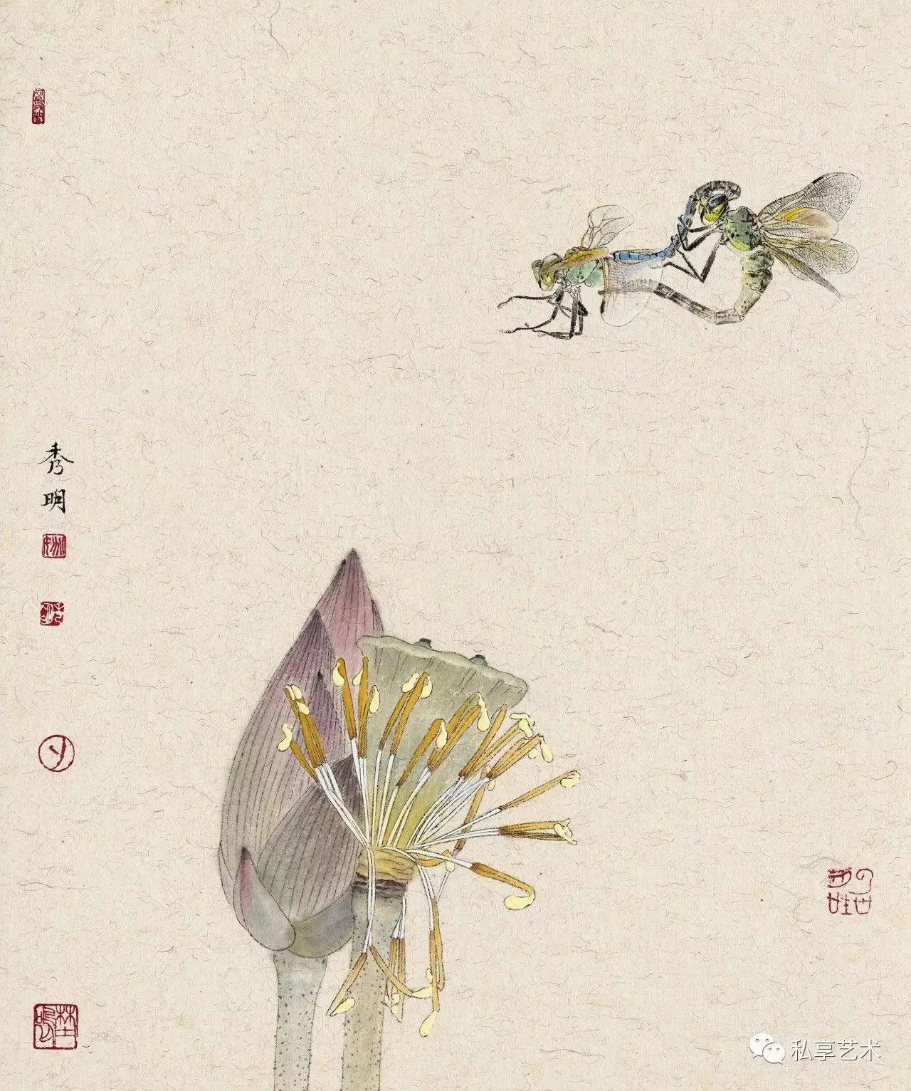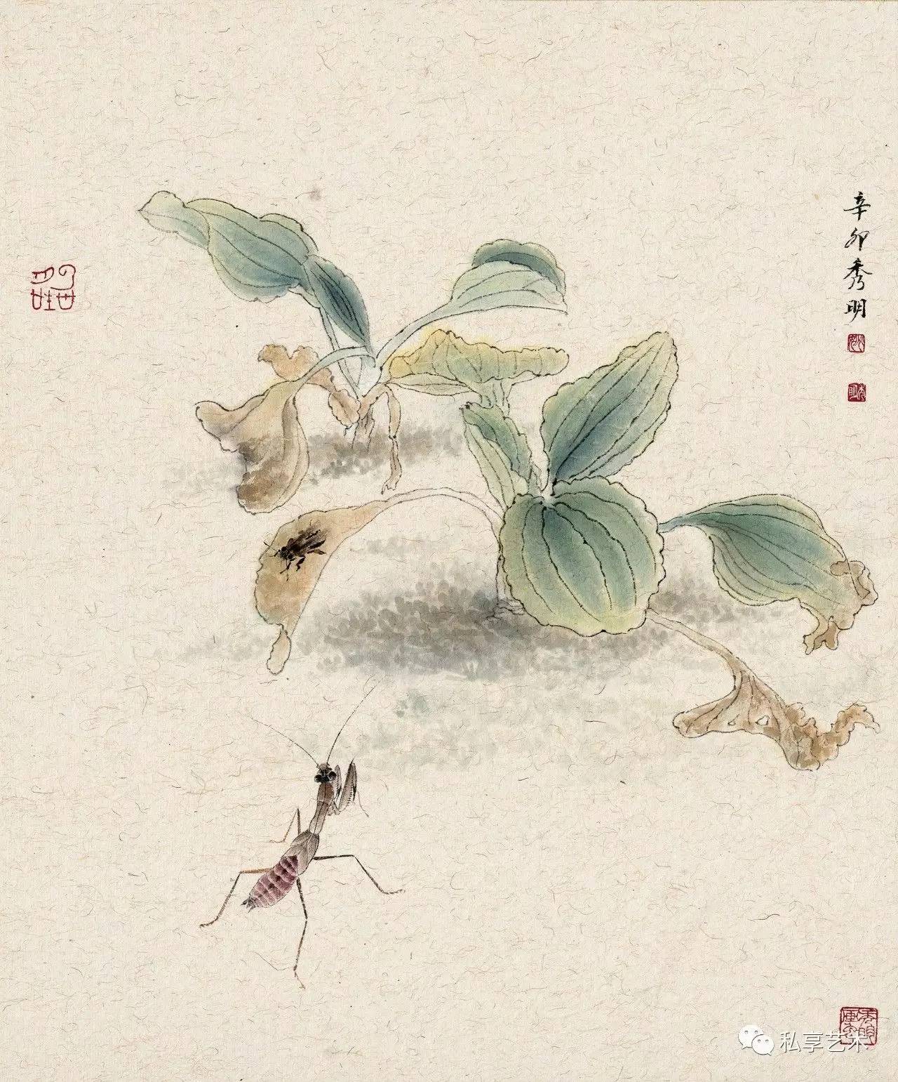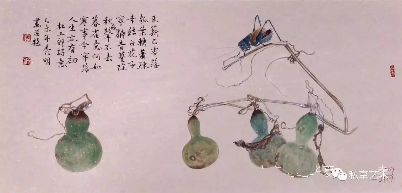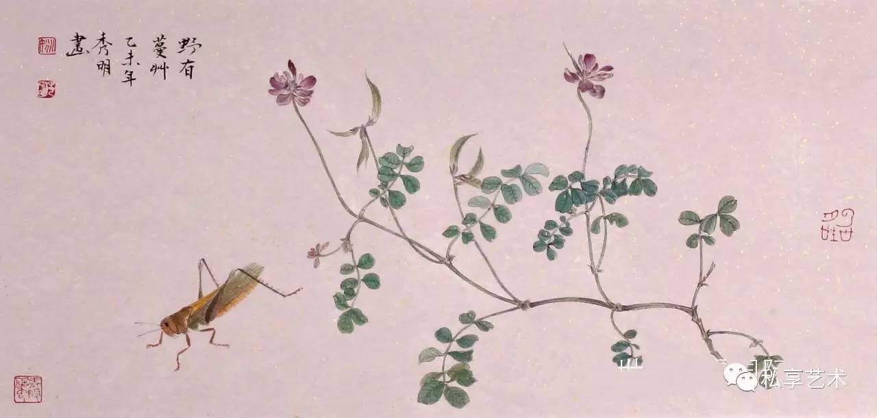 秀明工笔花鸟画中的植物多是生长于北方的,这与他的生活经历有关。他通过这些自幼就在其身边触目可见的草虫果疏等,描述的是自己与这些植物成长的经历,状写他们经受阳光、雨露、风霜、雨雪的历程。这是一部有关自然土地上万物生长的故事。因此,我们在秀明的工笔花鸟画中所感受的,就是一种不具任何矫情的自然本真的力量。这时,我们就几乎完全不会再在意那画面上题写的古代诗句,因为,这些被古代文人咀嚼了多少世代的诗句,在他所表现的动植的鲜活生动面前,已显得苍白。