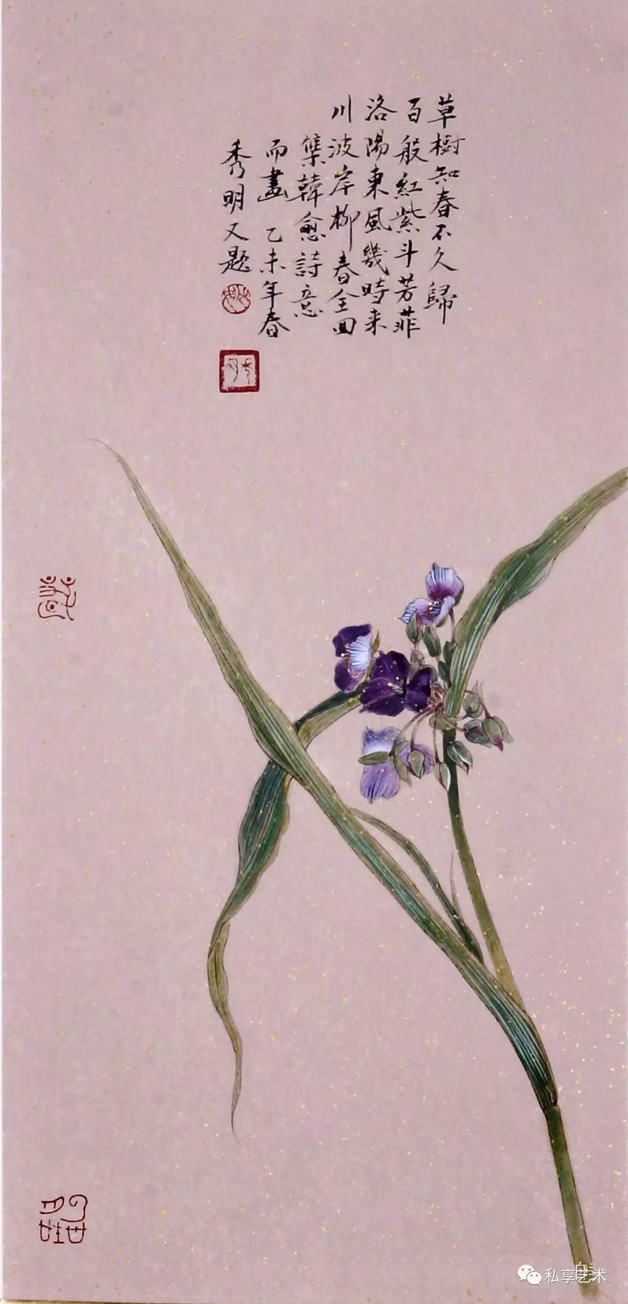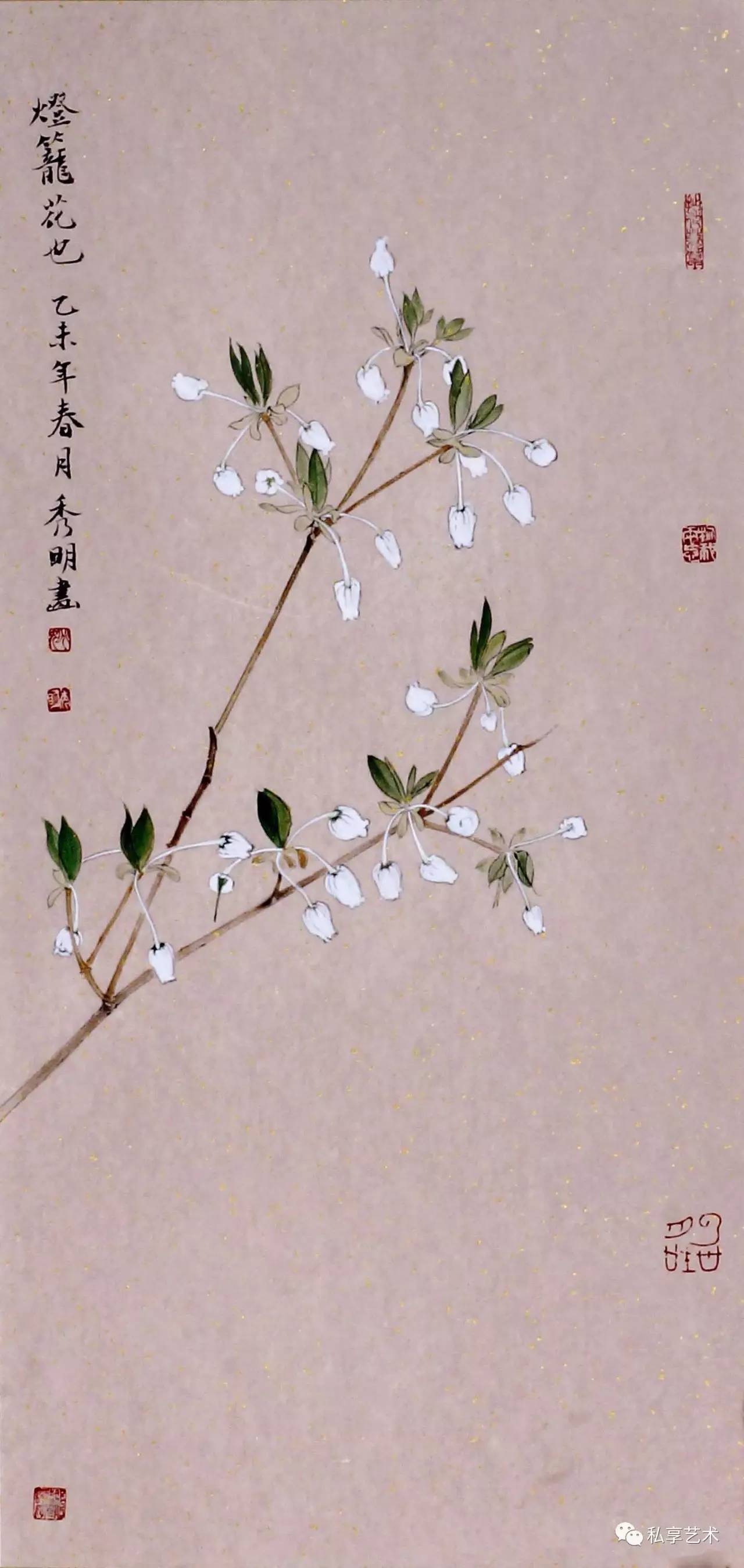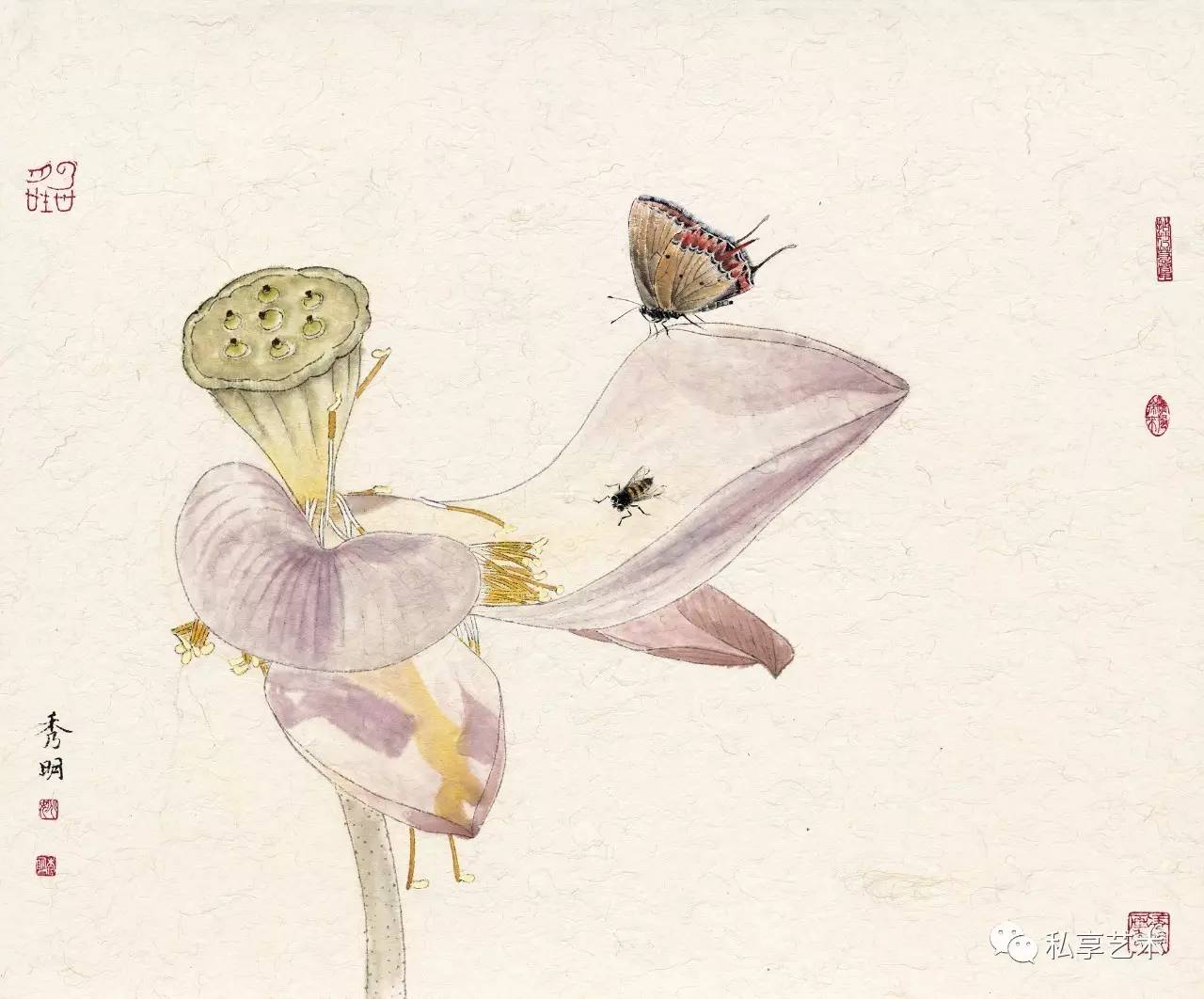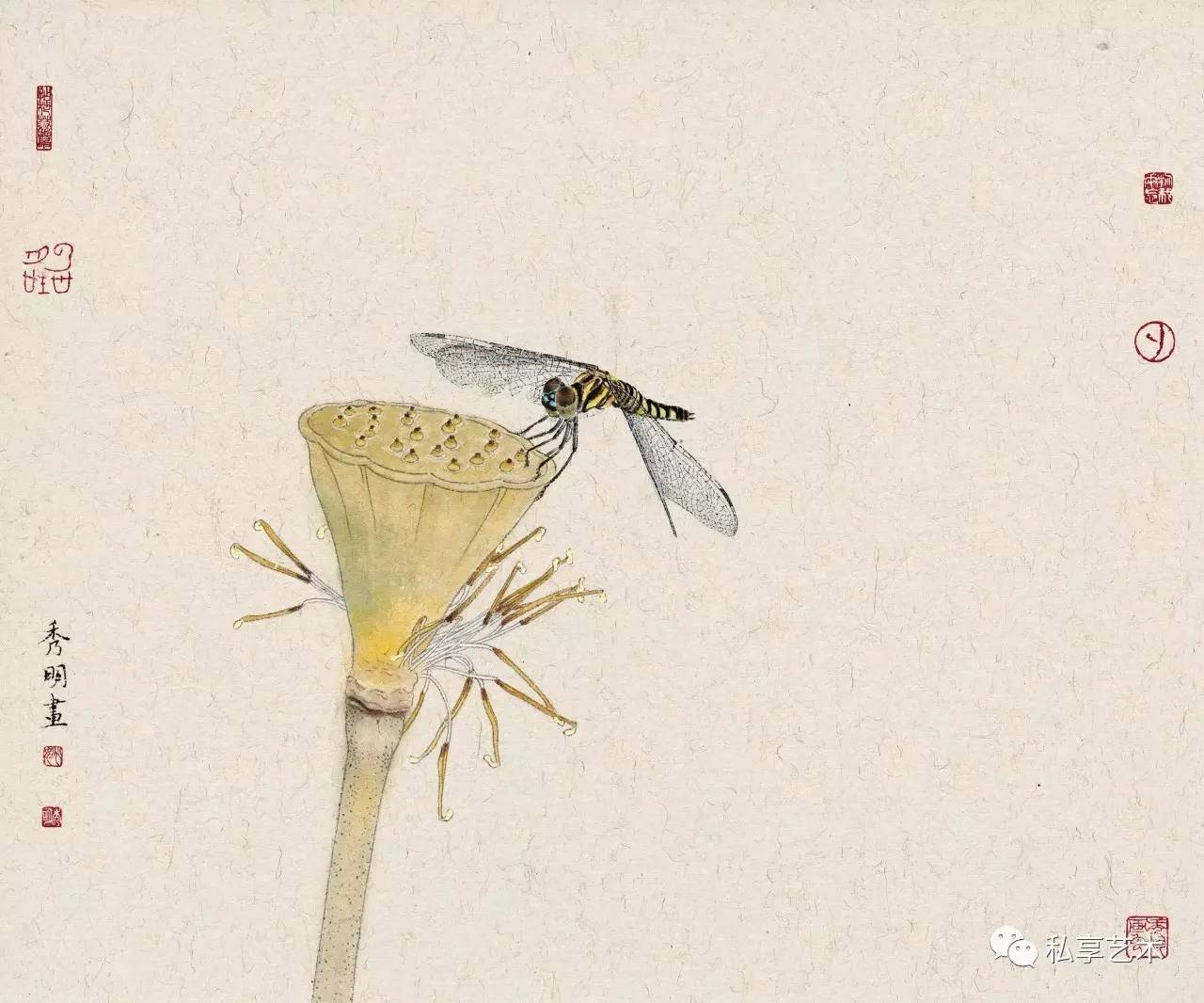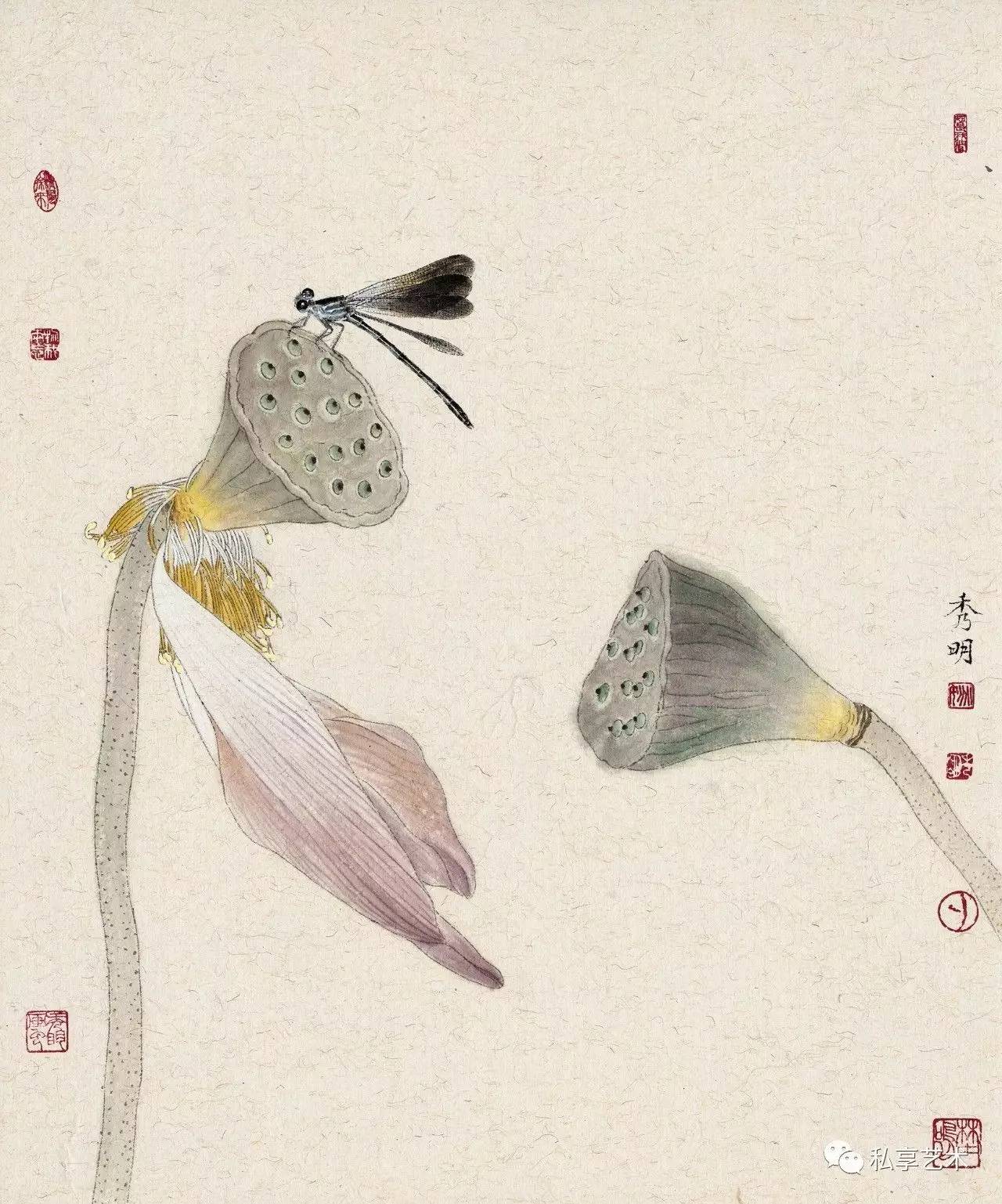 秀明工笔花鸟画中的植物多是生长于北方的,这与他的生活经历有关。他通过这些自幼就在其身边触目可见的草虫果疏等,描述的是自己与这些植物成长的经历,状写他们经受阳光、雨露、风霜、雨雪的历程。这是一部有关自然土地上万物生长的故事。因此,我们在秀明的工笔花鸟画中所感受的,就是一种不具任何矫情的自然本真的力量。这时,我们就几乎完全不会再在意那画面上题写的古代诗句,因为,这些被古代文人咀嚼了多少世代的诗句,在他所表现的动植的鲜活生动面前,已显得苍白。