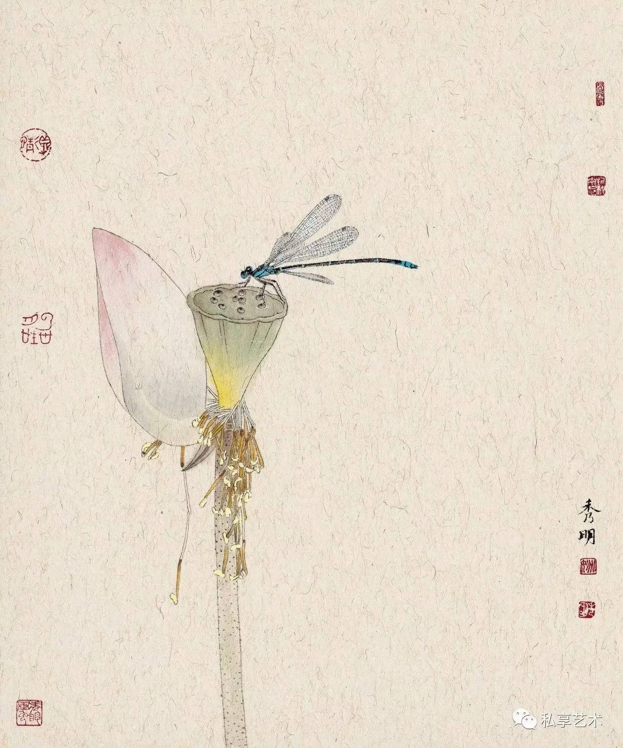 就这样,秀明的工笔花鸟画从古代文人的隐逸情怀中走出,它在乡野现实中找到情感的皈依;它也摈弃了古代宫廷式的花鸟趣味,而在形色间飘散着浓郁而朴素的田野风味。现实情怀与田野气息,使他的工笔花鸟具有一种亲切感人的魅力。