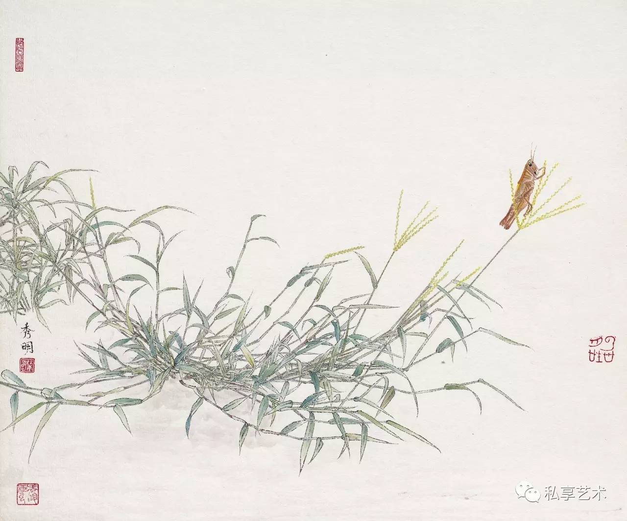 秀明的工笔花鸟画与这一传统是多少有着一种遥承关系的。然而,秀明工笔花鸟画的情怀、意趣却与这一传统很不相同。如果说,徐熙是通过凫雁鹭鸶、园蔬药苗等,来寄寓古代文人的一种淡泊情怀,那么,秀明笔下的竹木禽鱼、果蔬草虫等,则体现出他对于乡野风物的一种朴实、原始的热爱,他用画笔向我们传递的,是来自乡村大地上的朴野而蓬勃的生命讯息。