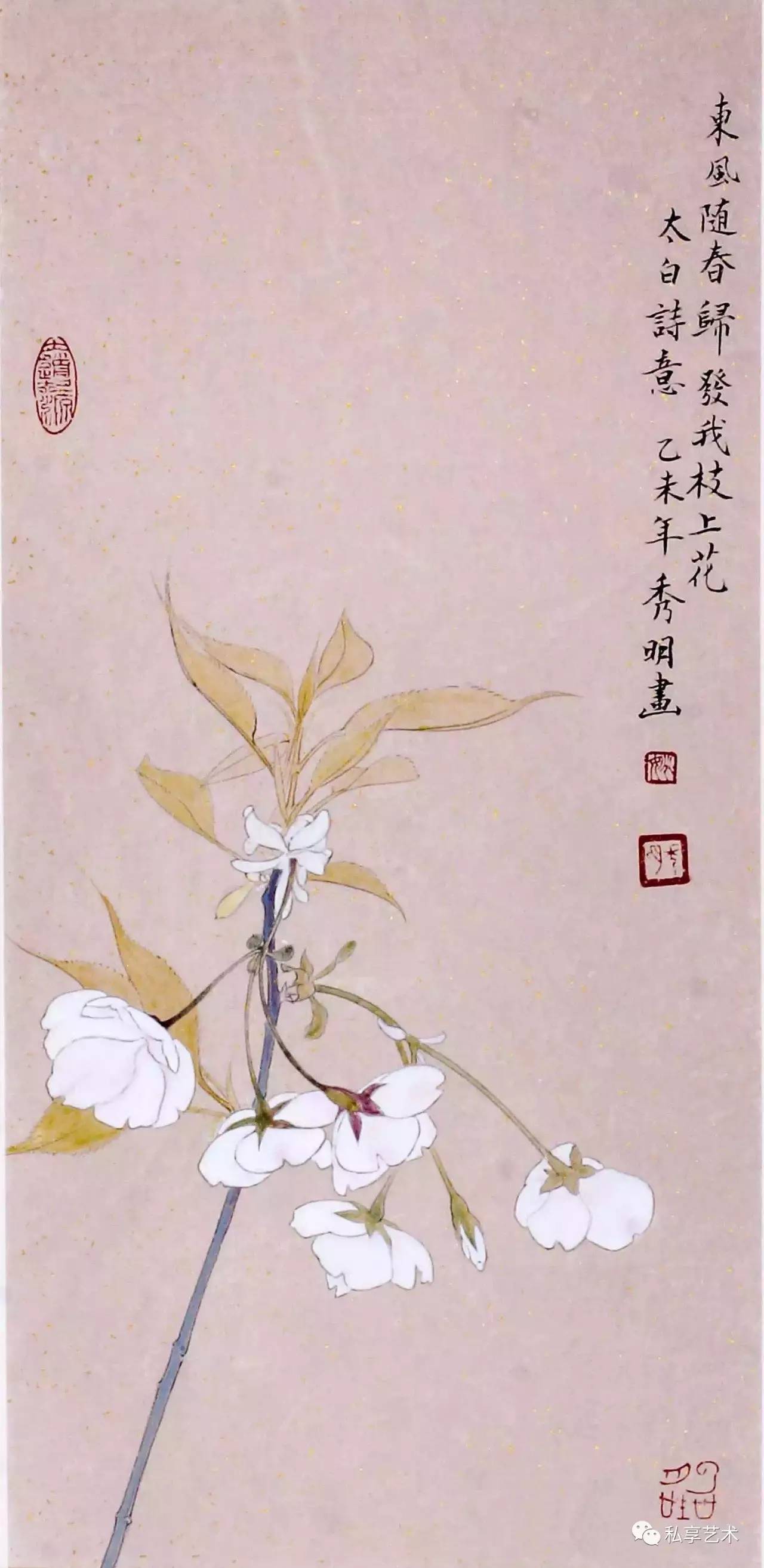 秀明工笔花鸟的线条挺劲爽快,是将北方男子的豪爽注入在了细若游丝的线性轨迹之中。楷书的笔法控制着笔的起落,张弛有度,优游从容;时有飞白呈现的笔致,显露出线条的弹性与节奏。另一方面,这些线条又是为表现他意象中的物象之美服务的,线条随着物体轮廓而起伏生长,一切起落、顿挫、粗细、方圆等,也都表现出物体的形质特征,从而达到了体积、质感、空间感及笔墨意趣的统一。秀明工笔花鸟画的线条就这样在描述与表现的双重意义下,营造了一个具有现实存在感与诗意想象及书法底蕴的自在空间。秀明多年来一直沉潜于这一空间,在静静的勾画中与自然对悟。当线迹结合为形状并进而形成鲜活的形象,一切童年的朦胧记忆也就骤然间被照亮了。这是一个充满乐趣与感动的创作过程,它驱使着秀明在这浮躁的社会中,一笔一笔地勾描,一线一线地塑型,去追逐那个诗意的梦。