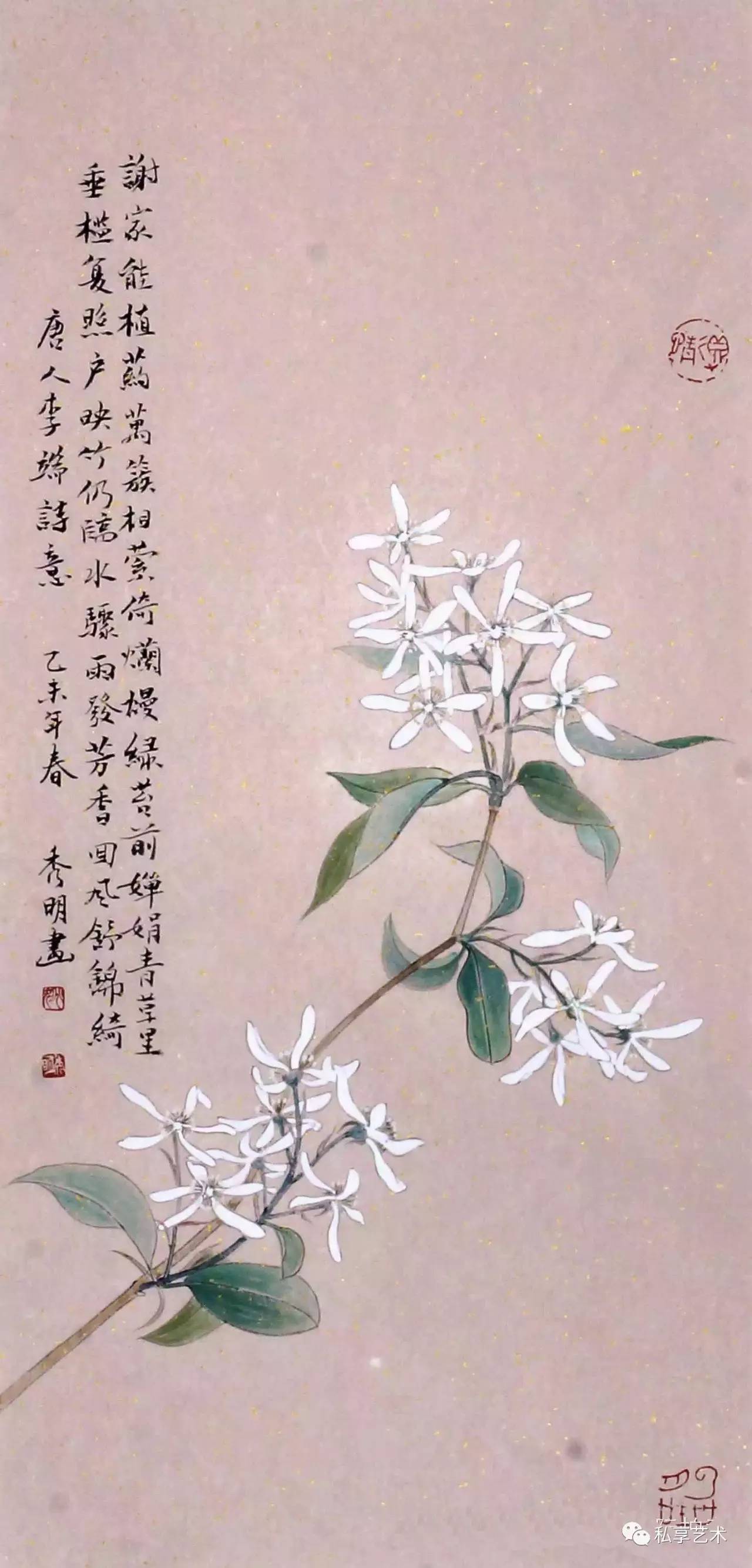 体认与观察相结合的方式,为秀明花鸟画的创作表达带来极大的自由,它可以对那些表面的细碎视而不见,而集中渲染物象的最本质特征。这样,秀明的花鸟就摆脱了时下工笔画创作中常见的柔糜碎腻陋习。更为重要的是,这种具有写意性格的工笔花鸟,使得他在着力表现动植的意象真实的前提下,能够对其工笔绘画语言进行自如的调动。于是,他强调了物象的外轮廓而减弱了对于其内部结构的过细刻画,色彩的渲染也脱离开具体的时空环境而因形推移;作为界定轮廓的线条被突出,物象色彩也表现出固有色的独特魅力。
