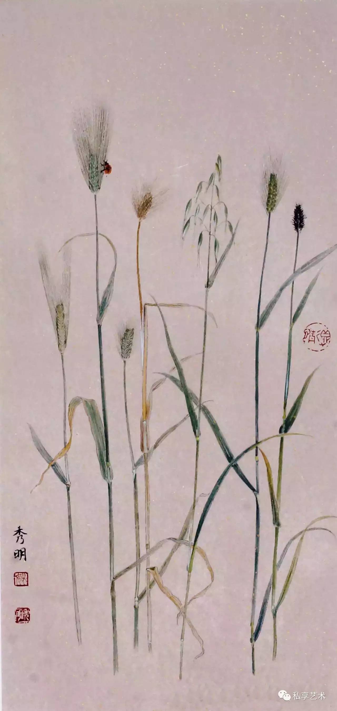 秀明毕业于解放军艺术学院美术系,在那里受到了严格的素描、色彩、造型训练;同时,他对传统工笔画也下了极大工夫,认真临摹了宋代院体画家的工笔画作品。从他的作品《露》中就可以看到林椿对于线形与染色的处理方式。院体工笔画对于秀明的影响,不仅是技法上的,他更敬慕于宋人那种对于自然细致入微的观察方式,和那种摄其本质的表现方式。秀明生长于北方乡村,自幼就对其身边的种植怀有浓厚兴趣,他与这些种植一样,都是在乡村这块土地上长出的自然生命,他与这些植物就像是天生的自然同胞一样,他不仅可以准确地辨识它们的外貌,而且,他更能感受这些植物的呼吸。