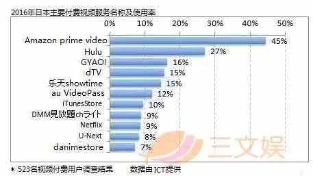 彼时还有Hulu(2011年进入日本)等一系列海外视频播放服务捷足先登,并在日本动画配信市场占据了重要位置。据日本ICT总研《视频付费配信市场动向调查》显示,2016年Amazon Prime Video使用率最高,Hulu位列第二。还有dTV、GYAO!、乐天showtime等本土厂商与Netflix角逐。