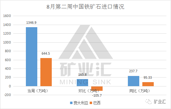 8月第二周,中国进口澳洲铁矿石发往我国1346.9万吨,周环比增加165.8万吨,相比去年同期增加237.7万吨;巴西铁矿石发货总量为644.5万吨,周环比减少105.7万吨,但较去年同期增加95.33万吨。