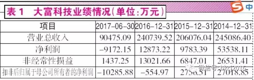 根据大富科技年报提供的数据,在2014年到2017年中期,其营业收入只有2016年相比2015年有所增长,但还是没有达到2014年的水平,今年上半年营收情况如果年化,预期营收也会有很大程度的下滑。