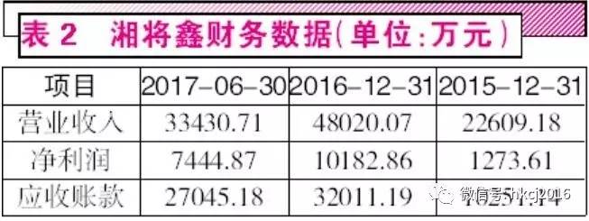 疑点一:在正常的企业经营中,伴随着营业收入的增长,企业应收账款也会有所增加,但如企业在正常经营下,销量越好销售收入越高,相应的也就越来越有市场话语权,因此应收账款的增速一般都不会超过营业收入的增速,除非企业为了让销售收入数字变得更漂亮,而不顾风险地对产品进行大肆赊销。而就草案披露的数据来看,湘将鑫似乎就存在上述大肆赊销的现象。草案披露,湘将鑫的应收账款增速是要远远超过营业收入增长的,这一点可从其应收账款占营业收入的比例上就能看出。如在2015年、2016年和2017年上半年,其应收账款占营业收入的比例分别达到45.34%、66.66%和80.90%,呈现出逐年大幅攀升的现象。这意味着,湘将鑫为了让销售数据更好看,其产品赊销是越来越疯狂,而这种做法无疑会让应收账款风险出现大幅增加。