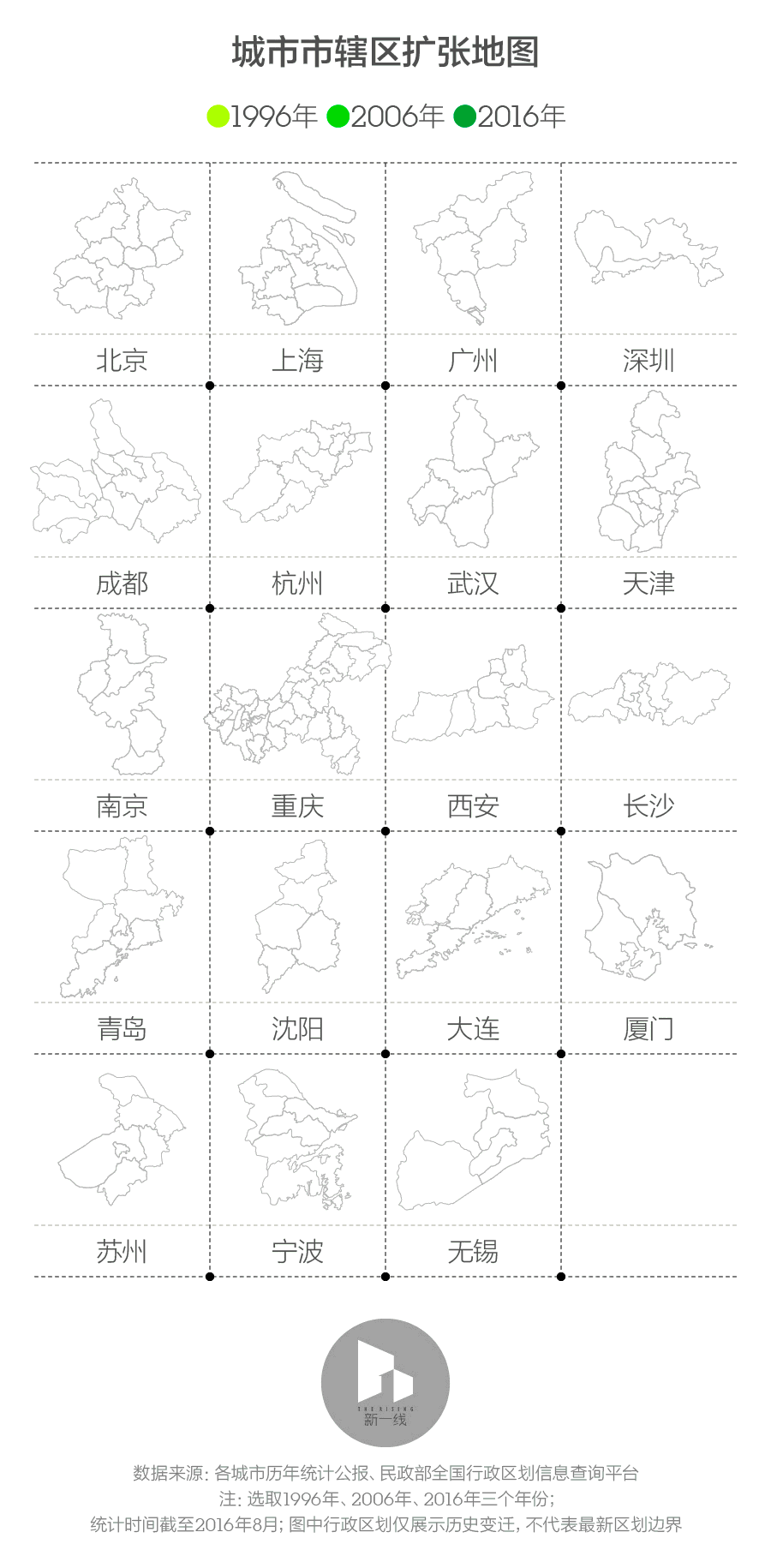 总之,这一轮的城市扩展,表现出的力度前所未有。由于新增城区,都属于传统上的郊区,远离城市中心,面积又远远大于市中心行政区,这使得这些城市发展多了无数的可能。