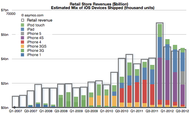 根据第三方数据机构Asymco的图表来看,2012年的第一、二、三季度的销售业绩要比往年(2007至2011年)同时期都高。