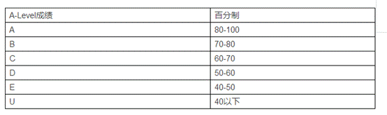 A-Level的考试成绩分为六个等级,即A、B、C、D、E、U。A为最优,E为通过,U为不及格,与百分制换算关系如下: