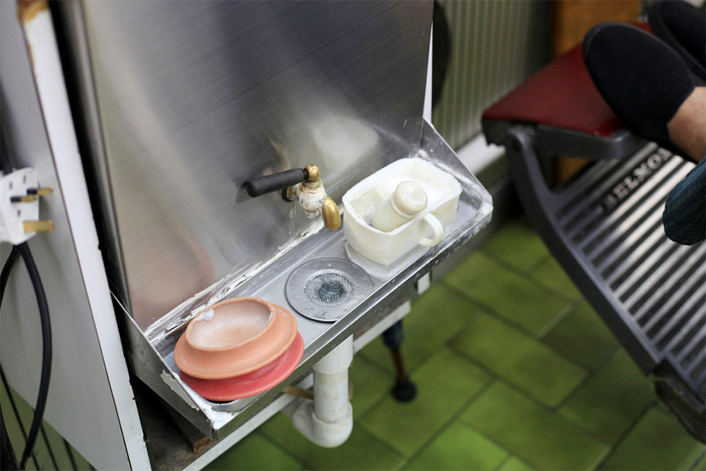 男宾部设有一个热毛巾筒及刮胡子用的润滑膏。师傅在刮胡子前,都会用滚烫的热毛巾敷在客人脸上,扩张毛孔。