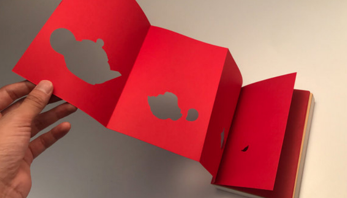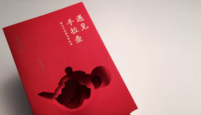 镂空叠加封面,从一片茶叶、潮州地图、一块朱泥,到一把水平壶,暗喻手拉壶的缘起:因茶而生,源自潮州,一小块朱泥,经过匠人的巧手,一步步变成手拉壶的形状。书名烫金,与大红底色相得益彰。