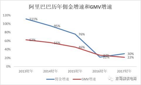 此外,也是最重要的一点,此次公布的佣金是整个电商业务的佣金收入,但却只公布了天猫GMV,缺少淘宝数据。虽然天猫的GMV占比逐年提升,但是截至到2017财年,也只有42%。换句话说,阿里一半以上的GMV仍然来自于淘宝。我们整理了阿里巴巴历年佣金增速和GMV增速。
