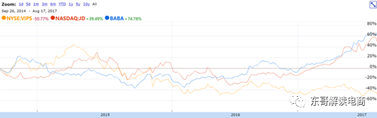 从上图可以看出,阿里、京东、唯品会三巨头在2015年、2016年的时候股价涨幅差异不大,尤其是同为B2C模式的京东和唯品会,股价变化几乎同步。但从去年底开始,唯品会掉队了,而京东和阿里的股价则快速上升。究其原因,2015年之前,行业整体的饱和程度还不像现在这样高。各巨头间的竞争并非零和游戏,即便是市场份额下降的情况下,也可以保持不错的成长。但2016年下半年开始,行业环境恶化加剧,从原来的增量市场逐渐变为存量市场。阿里、京东获得的份额就是唯品会等其他电商失去的份额,因此三者股价走势分化。