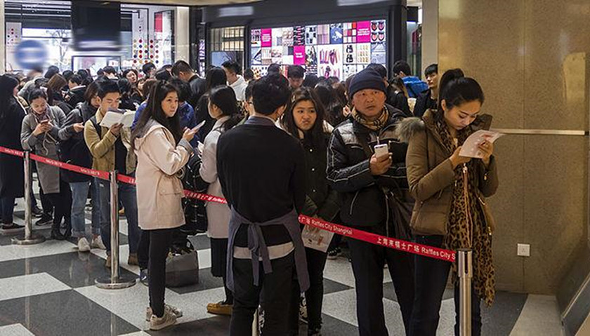 商场10时开门,记者随“姐妹花”到了茶店后门。9时50分,便有约25位“自己人”摆好了排队架势。5分钟后,保安发排队号码牌。记者顾盼,排队者中数位是在热狗店见过的熟面孔,点头致意。