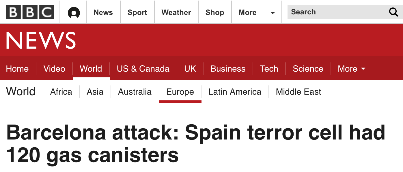 【巴塞罗那恐袭:恐怖分子据点有120只燃气罐】西班牙警方说,上周在西班牙制造两起恐怖袭击的12人恐怖分子团伙收集了120只燃气罐,并计划将其用于汽车炸弹袭击。这些气罐被发现位于西班牙东部城市阿尔卡纳尔的一栋房子内,该房屋周三晚上发生了爆炸。