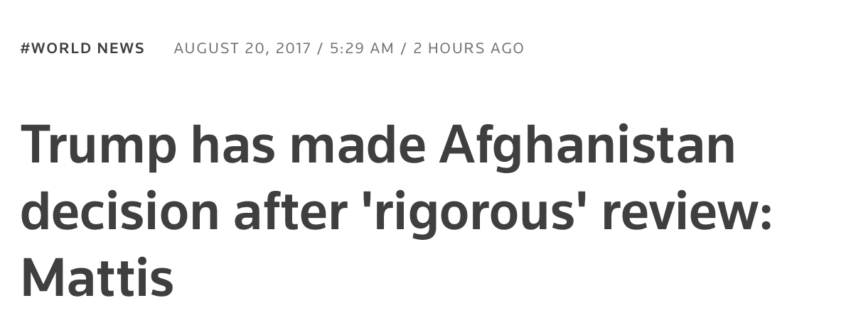【美国防部长:特朗普已做出对阿富汗决策】美国国防部长马蒂斯周日说,特朗普在“严格的”审查程序后已做出美国对阿富汗的战略决策。