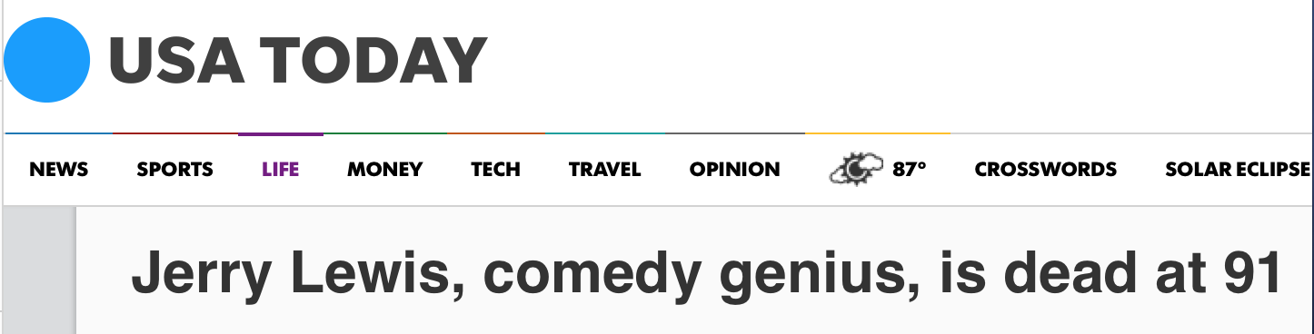 【美著名喜剧演员杰瑞刘易斯去世】美国著名喜剧演员杰瑞·刘易斯(Jerry Lewis)周日于家中病逝,享年91岁。