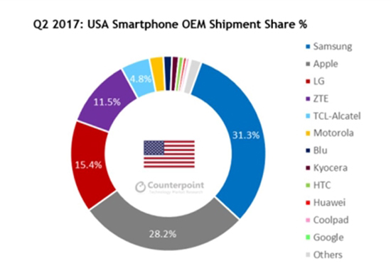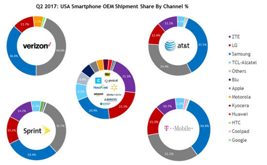 但在北美市场,中兴却凭借深耕了十多年运营商渠道,在2017年Q2出货量排名上位列第四。因为运营商是北美出货的第一渠道(占比约75%),中兴和四大运营商之外的小运营商合作密切,甚至高居第一。