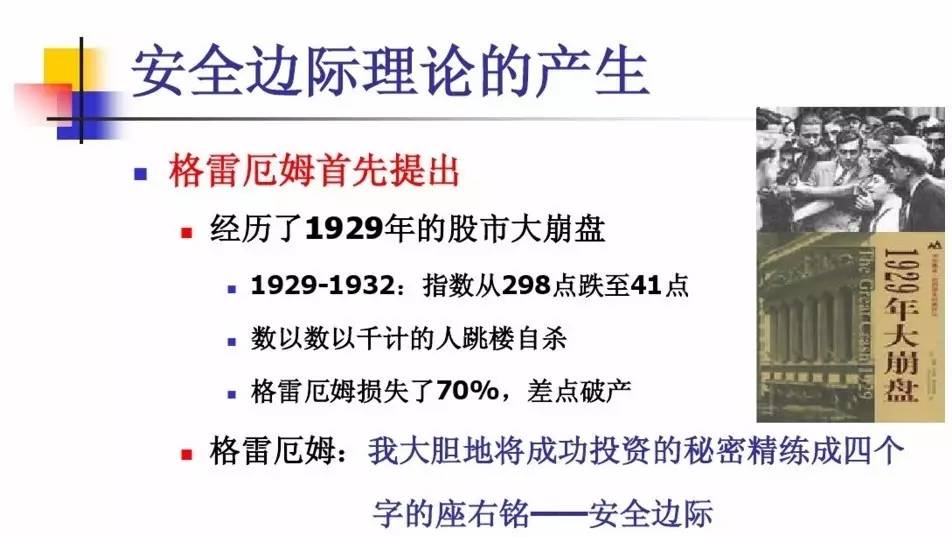 安全边际是多少?巴菲特对于根据安全边际进行的价值投资有一个形象的比喻:用4毛钱购买价值1元钱的股票。也就是说,价格相对于价值打了4折。格雷厄姆认为,只有价值显著高于价格才具有足够的安全边际。他列举出的一个称得上廉价的股票标准是:价值至少要比价格高出50%以上。换句话说,价格相对于价值至少低估了三分之一以上,相当于打了6.6折。