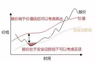比如我们看这张图,以黑色曲线表示股价,它是波形上涨或下跌的,股票内在价值随着公司的业绩不断的增值,当股价低于内在价值,触碰安全边际就可以考虑买进;当股价高于价值,可以考虑卖出。