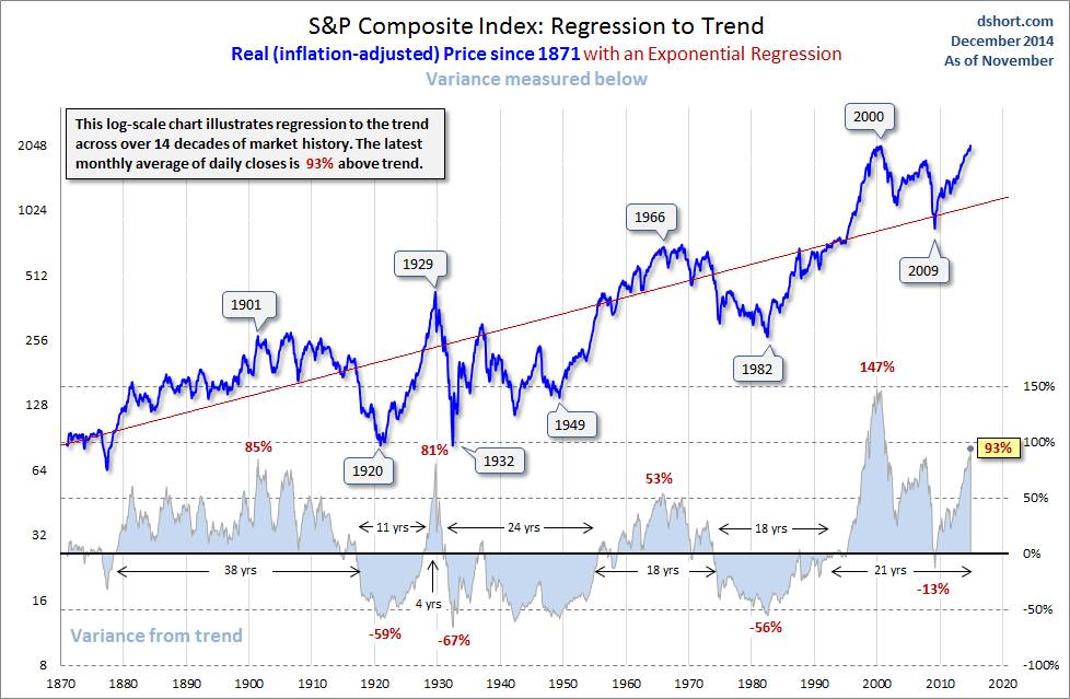 这是美国标普综指走势图,在140年的尺度区间里尽管发生很多事情,有1929年的大萧条,也有2000年互联网泡沫破裂、2008的经济危机、指数大幅波动,但指数的趋势线是直线增长的。