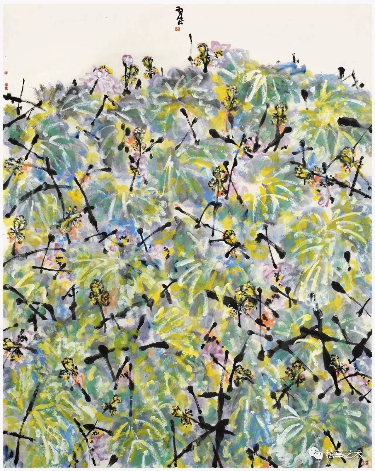 许是精工设计原因,羽空绘画构图经营到位,轻易超越了不少还在位置布局问题中摸索的众人。另,“重彩”荷花四联,青绿赭黄、用色又独有奇谲,倒显出西方热抽象一样的魅力来。