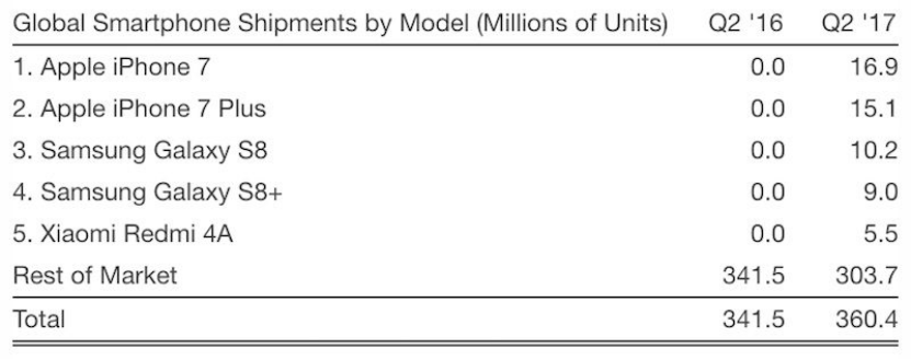 市场研究公司Strategy Analytics最新报告显示,今年第二季度,全球最受欢迎的智能手机仍是去年推出的iPhone 7 以及iPhone 7 Plus ,而今年四月登场的三星 Galaxy S8 与Galaxy S8+ 则位居第三及第四名。今年4月至6月,苹果 iPhone 7的出货量为1690万,iPhone 7 Plus的出货量为1510万,三星GalaxyS8 和三星GalaxyS8+的出货量分别为 1020 万和 900 万,而排名第五的红米4A出货量则是 550 万。