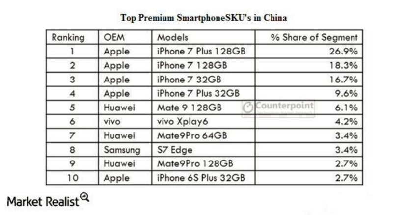 最近,钉科技注意到,数据调研机构Counterpoint对国内高端手机市场份额TOP10进行了排名,毫无疑问,苹果高居首位。在TOP10机型中,苹果有3款机型上榜,分别是iPhone 7 Plus、iPhone 7和iPhone 6s Plus,其中128GB版本的iPhone 7 Plus最受欢迎,其次则是128GB版本iPhone 7,而7P的总份额达到了36.5%,iPhone 7的总份额达到了35%,加上iPhone 6s Plus的份额,苹果在高端机型的占比高达74.2%。
