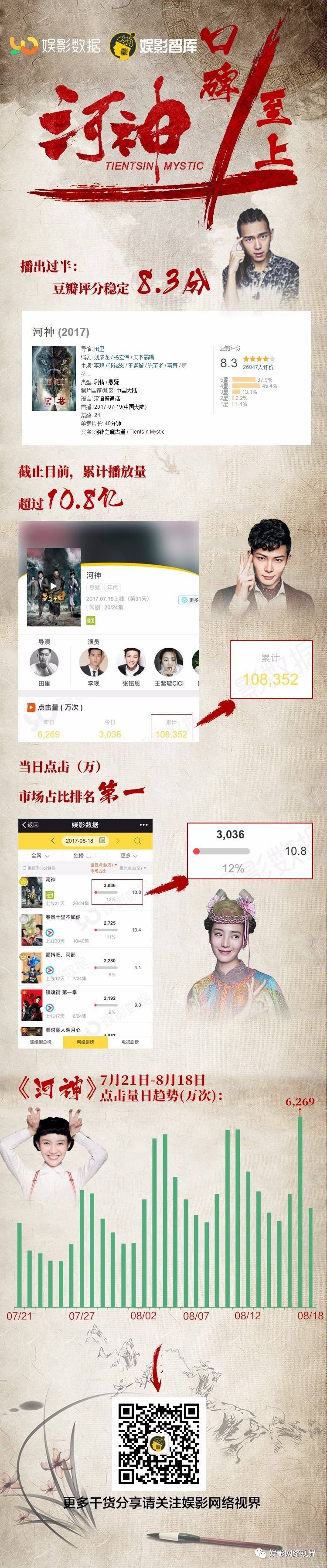 该剧由爱奇艺、工夫影业联合出品,闲工夫制作,李现、张铭恩、王紫璇、陈芋米等主演,讲述了民国年间天津卫的一段奇案。截至目前,《河神》播出过半,累计点击量10.8亿,豆瓣评分稳定在8.3分;更多数据分析戳下图↓↓↓
