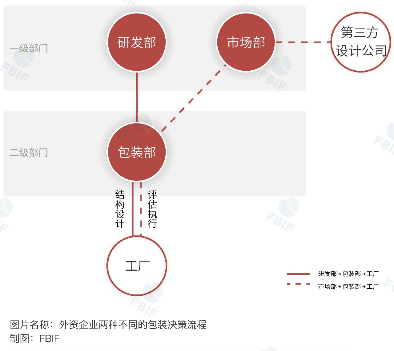 外资企业的包装创新整体处于领先水平,这和企业内部明确的包装职能划分有很大关系。外企的包装部门一般隶属于研发部,主要职能有两个:包装结构设计优化,以及将包装方案评估执行。而平面设计则由市场部与第三方设计公司对接,或直接由品牌经理决定。简而言之,包装部决定结构,市场部决定平面,最终再由包装部落地实施,结构清晰,分工明确。