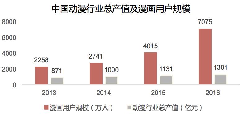 我们判断一个市场是否具有潜力,数据是最直观的证明。根据公开报告显示,漫画产业用户规模持续增长,2016年已超过7000万,年增速40%以上,而随着上文提到快看宣布用户破亿,这一市场的增速比预想中更快。从总产值千亿级别的动漫产业来看,漫画产业占比4%,高增速与低占比揭示的是漫画产业未来蕴含的巨大机遇。