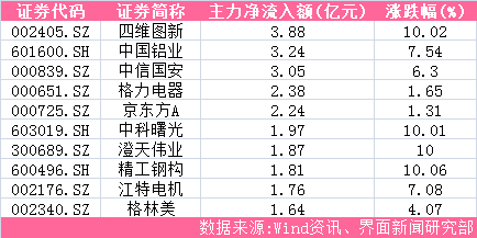 今日人工智能板块多只个股走强。“人工智能+车联网”概念股四维图新(002405.SZ)获主力资金热捧,凭借3.88亿元的主力资金净流入位居两市个股首位,并于尾盘实现封板涨停。另一只人工智能概念股中科曙光(603019.SH)吸引1.97亿元主力资金抢筹,亦以涨停报收。此外,沉寂多日的周期股再度“王者归来”,中国铝业(601600.SH)、精工钢构(600496.SH)两只标的股跻身两市主力净流入前十,其主力净流入额分别为3.24亿元、1.81亿元。
