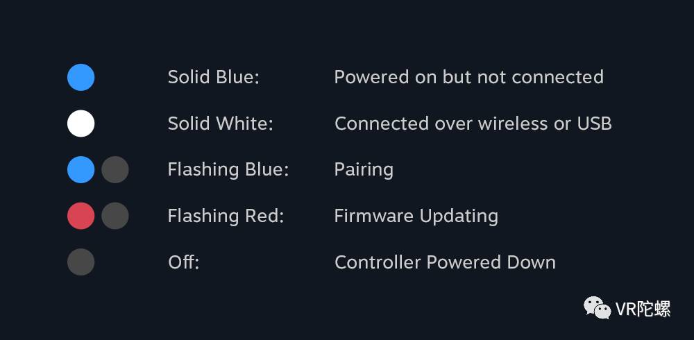 和Vive wands类似,Knuckles上也有一个小LED等来帮助用户判断手柄的不同情况。根据官方给出的说明,持续亮的蓝灯代表已开机,但并未连接;持续亮的白灯表示已通过无线或者USB连接;闪烁的蓝灯表示正在配对;闪烁的红灯表示固件正在更新;不亮灯表示未开机。