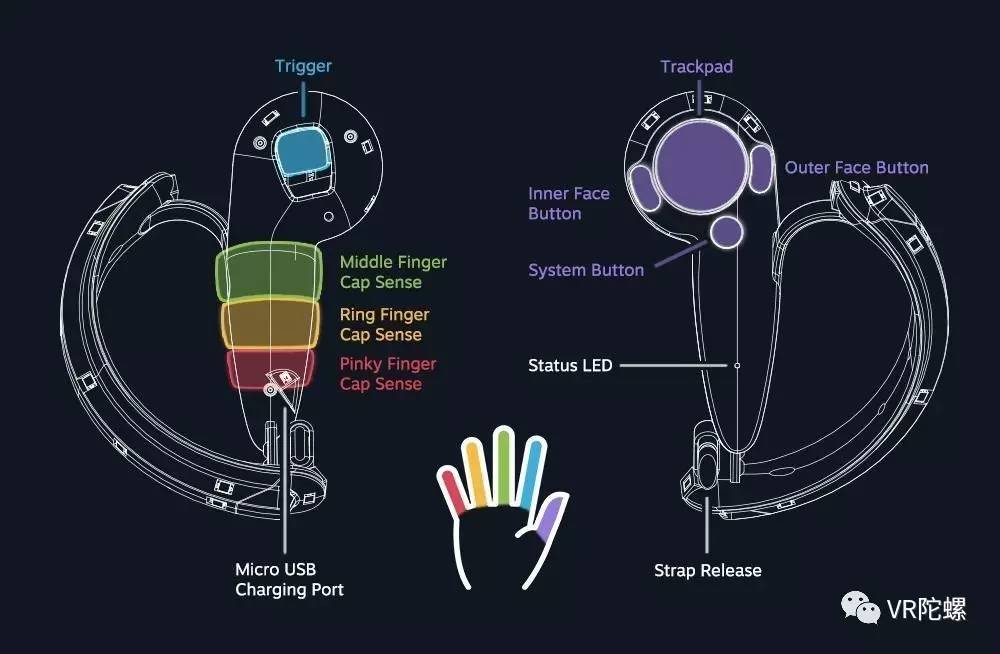 从Valve官方给出的说明我们可以看到,手柄的不同位置可以感应不同的手指,十分真实的模拟抓取和释放物体的感觉。手柄触控板的两边各有一个面按钮,下方有一个系统按键。手柄反面有一个扳机,下方还配备了微型USB充电接口。整体来看,Knuckles非常精简,同时符合人体工程学。