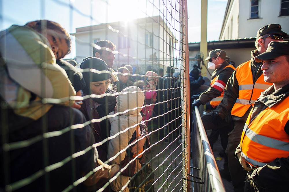 2015年10月22日,移民们透过栅栏等待跨越斯洛文尼亚-奥地利边界小镇施皮尔费尔德。成千上万的人等待着穿过这个边境接壤小镇,得以进一步深入奥地利和德国。奥地利政府与民众基本态度是接受难民的,但在是否应该对入境难民进行筛选、如何安置难民等方面,奥地利政府仍需想出合理的应对措施。此外,大部分难民都希望前往德国,因为他们认为德国的各方面条件发展比较好,德国政府也比较能够接纳。