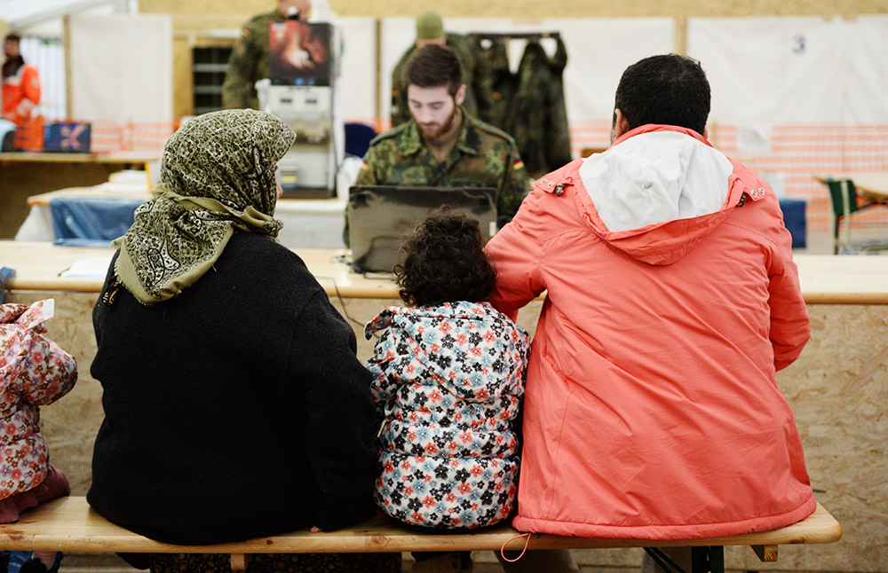 2016年1月31日,叙利亚难民在德国南部的德国空军基地等待注册。德国对待难民的积极态度,使其重新登上了欧洲道德至高点。而德国优渥的难民政策、发达的经济环境,也成为了难民心目中最向往的目的地。难民的引入,某一程度上也缓解了德国老龄化缺乏劳动力的境况。但难民数量过多以及安全性隐患,也是德国女总理默克尔不得不面对的问题。