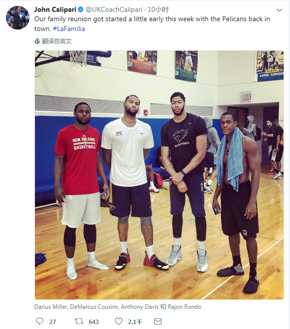 北京时间8月22日,肯塔基大学主教练约翰·卡利帕里在推特发了一张合影,并写道:“鹈鹕队归来,本周早些时候,我们一家人又团聚了。”图片中是鹈鹕队的四名肯塔基大学校友:安东尼·戴维斯、德玛库斯·考辛斯、拉乔·隆多、达柳斯·米勒。四人在大学时期都曾为肯塔基野猫队效力。