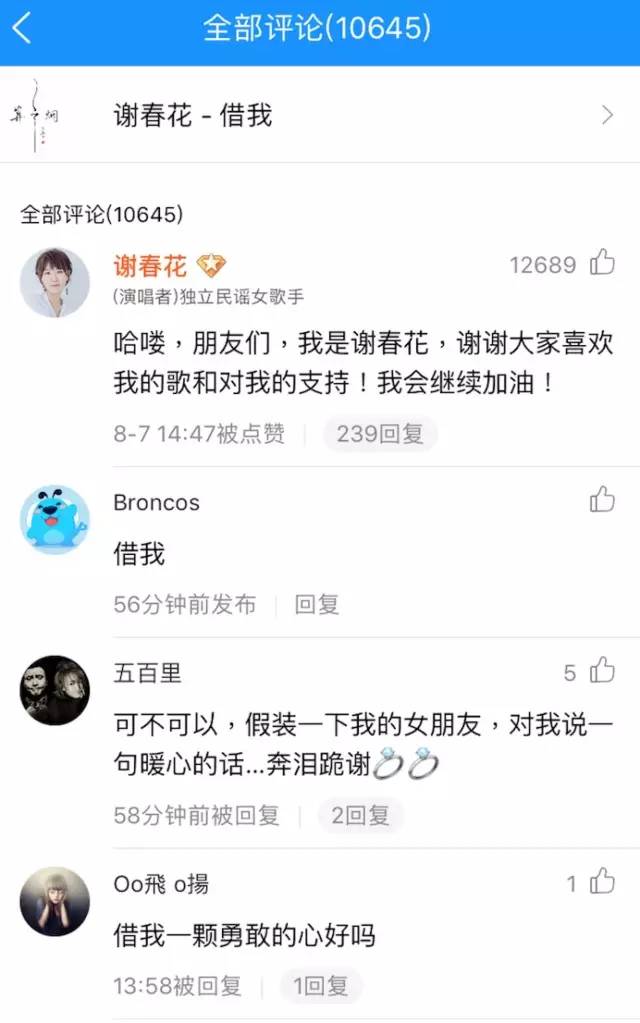 入驻酷狗音乐的独立音乐人,一部分本身已经具有了一定知名度,另一部分则是从腾讯音乐娱乐自家平台成长起来的原创歌手。谢春花显然属于前者,作为2016年上升速度最快的独立音乐人之一,其微博粉丝数目前已经超过了55万。8月7日,谢春花正式入驻酷狗音乐并与歌迷在评论区进行互动。“哈喽,朋友们,我是谢春花,谢谢大家喜欢我的歌和对我的支持!我会继续加油!”谢春花在自己创作并演唱的歌曲《借我》下留言,获得了过万的点赞数。