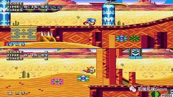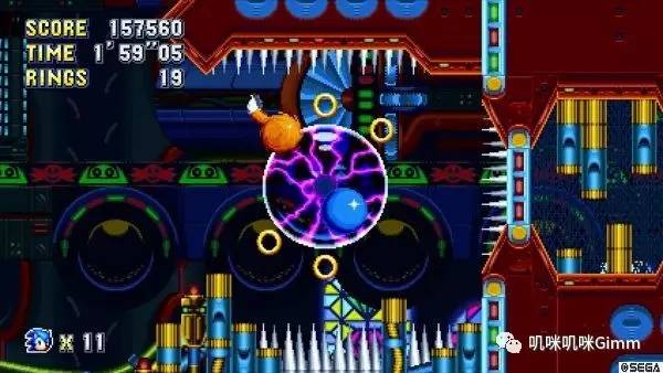 你会发现,从《刺猬索尼克3》来的化学植物区的前身里,出现了可供充能的电子显示器,还有泡沫盾牌等道具,它们可以让你摆脱窒息的威胁。逃生路线的所有部分都已经被调整、重新排列,并用新的道具重新设定:例如凝胶槽,你可以通过跳上巨大的注射器来使它们硬化成弹跳垫,就连游戏中的大BOSS们也已经完全重新被设计了。